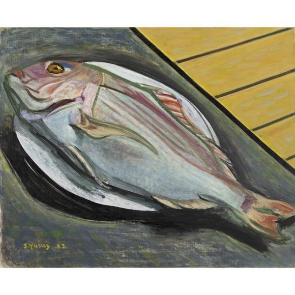 テーブルに置かれた皿からはみ出すほどの大きな鯛が、右から左上へ頭を向ける構図で描かれている。さらに、皿を載せたテーブルをわずかにずらし、金茶色の床板の板目を画面に取り入れることで、俯瞰的な視点が生まれている。この独特の構図が、安井曾太郎の表現の豊かさをいっそう際立たせている。安井はしばしば、身近な人から贈られた果物や花などを題材に静物画を制作したことが知られている。しかし油彩による制作には時間を要し、その過程で花は変色し、枯れ落ち、果物は腐食してしまうことになる。