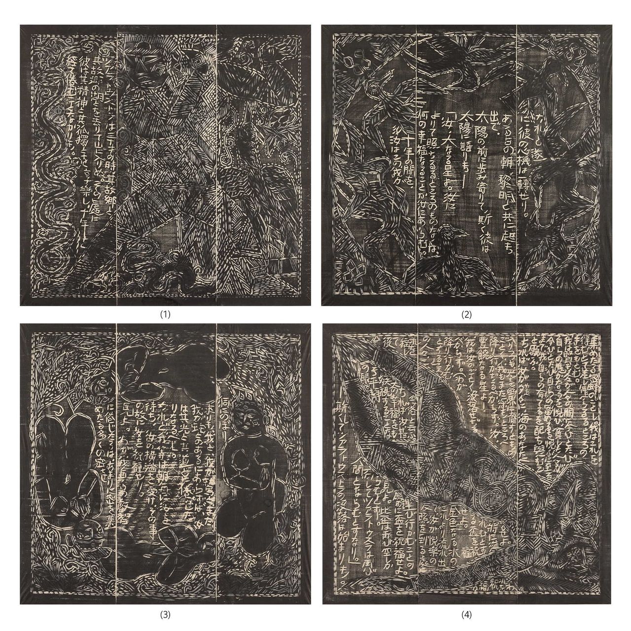 一図「黎明」には、ニーチェが海抜六千フィートのエンガディーン地方のシルス・マリアの森のほとりのシルヴプラーナ湖岸の巨岩の陰で出会ったというツァラトゥストラの立像に、鷲と蛇を従えて、ツァラトゥストラが洞窟の中から星をのぞみ、おお星よ、とつんざくような叫びをあげている感じを出し、二図 「真昼」には、太陽の内輪に鳥の群れ、太陽にいる烏、三本足という伝説の烏を、太陽の形どった、丸い偉大な光の外側に、羽をひろげさせてつながらせた。第三図「夕宵」は、上下左右に裸婦を、裸の女体を、やはり丸い形にして、天に遊んでいる姿にしたく作る。その女人達はみな行儀よく坐っている、それは夕宵の静まってゆく静止の姿を出そうとした。第四図「深夜」は眠れるツァラトゥストラを横たえた図。ツァラトゥストラが天から没落しつつある姿体を一杯にあらわし、ここに始まる幸の象徴にしようとしたと棟方は語る。