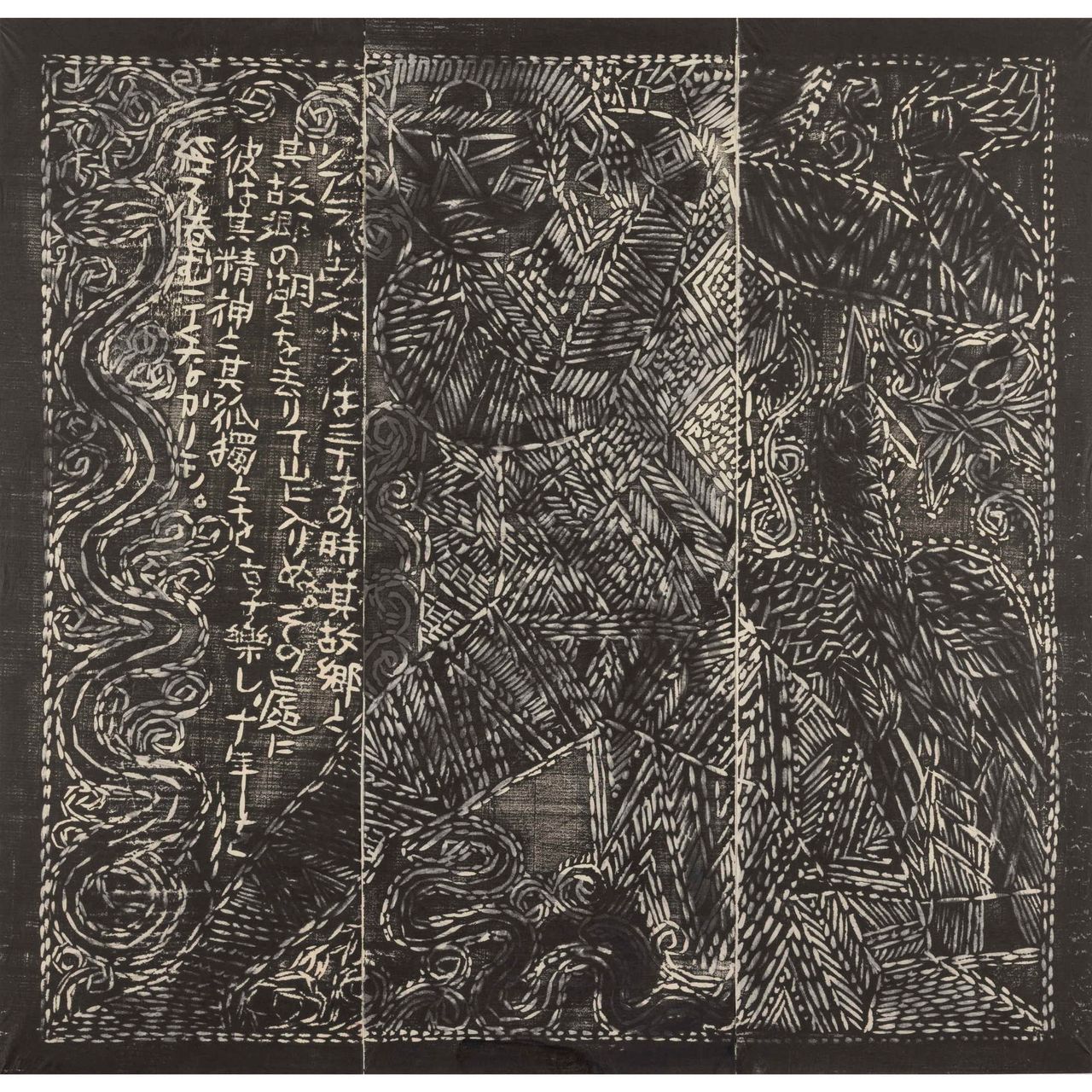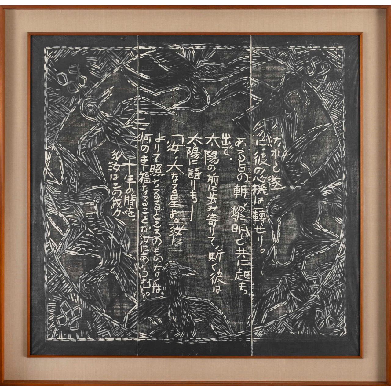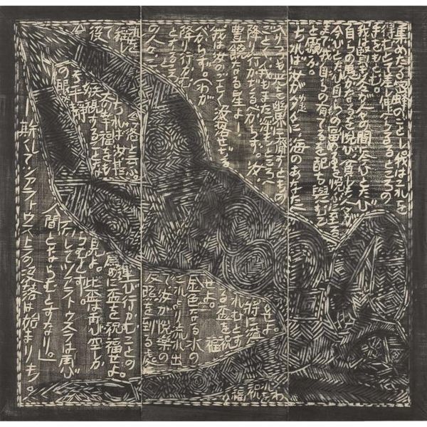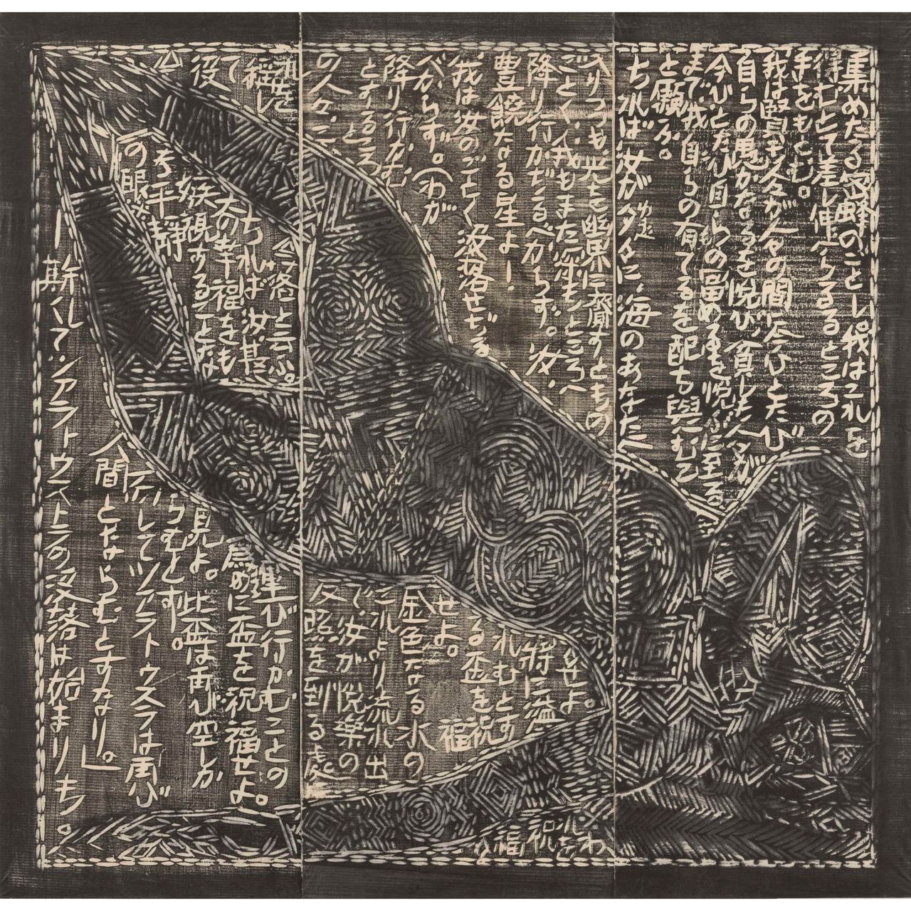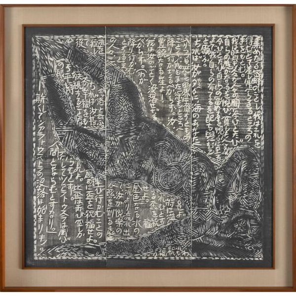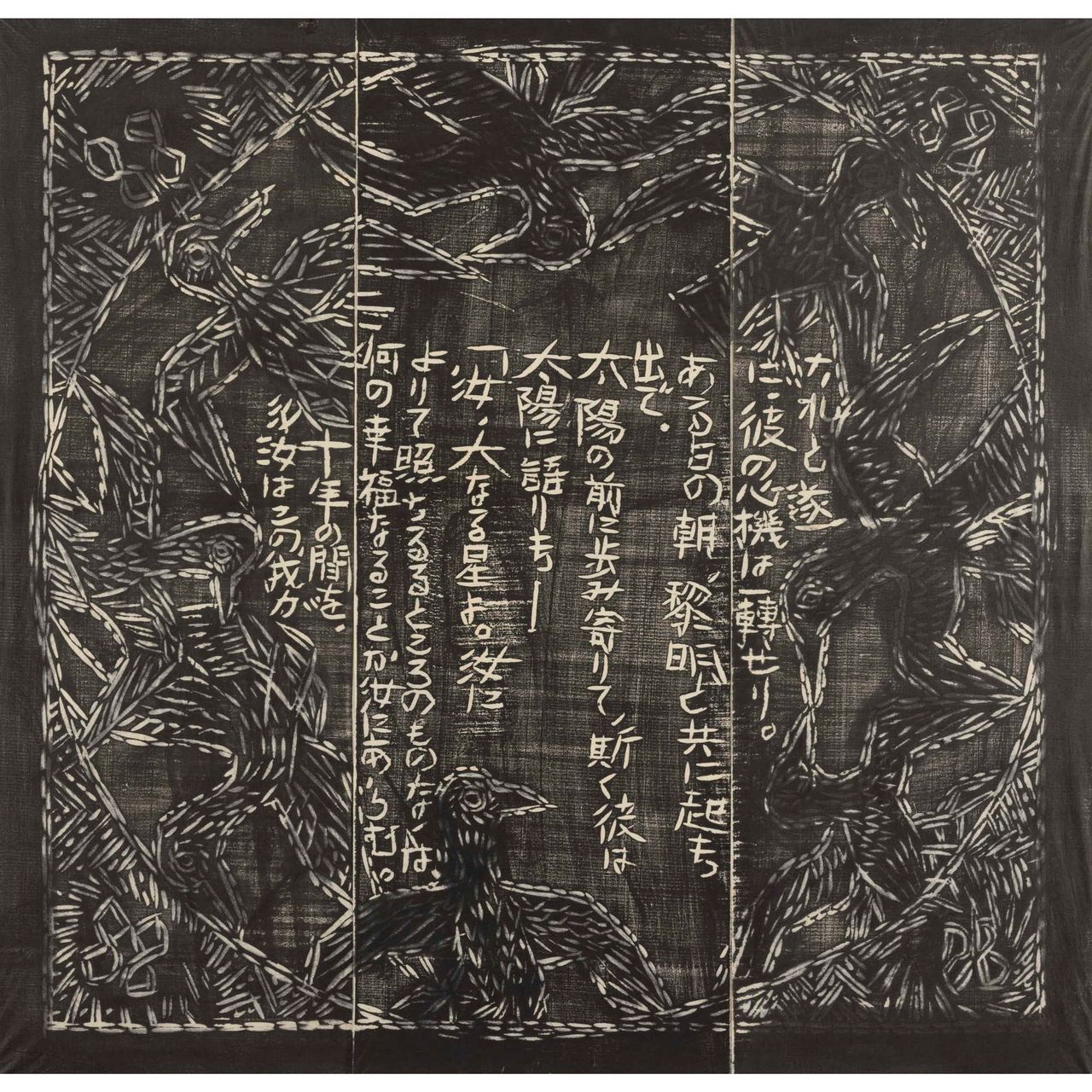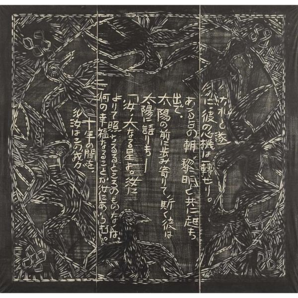 本作は『運命版画柵』は、別に『美尼羅牟(びにろん)頌運命版画柵』とも命名され、棟方が、昭和26年(1951)に疎開先の富山県福光町(現南砺市)より東京荻窪に再上京し手掛けた最初の作品で、4部柵として構成される。「運命」とは、ベートーベンの第五交響曲から主題とし、疎開先で読んだニーチェ全集から「ツァラトゥストラの巻、第一部序説一」を全面に彫制作したものである。