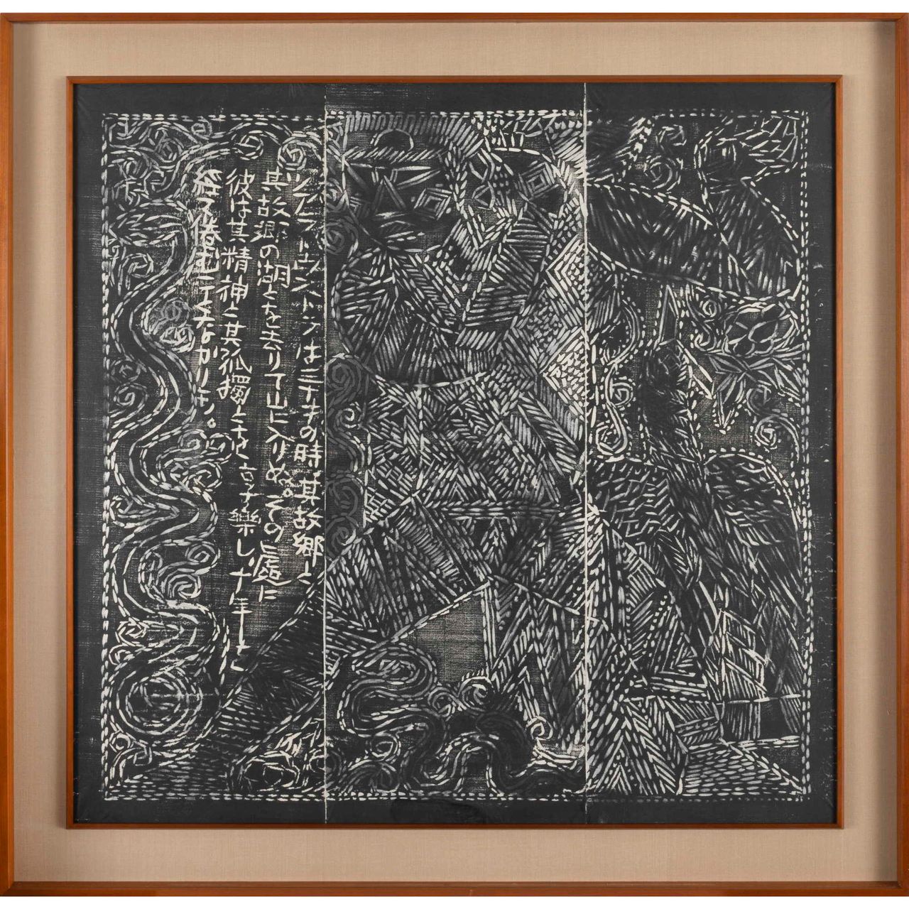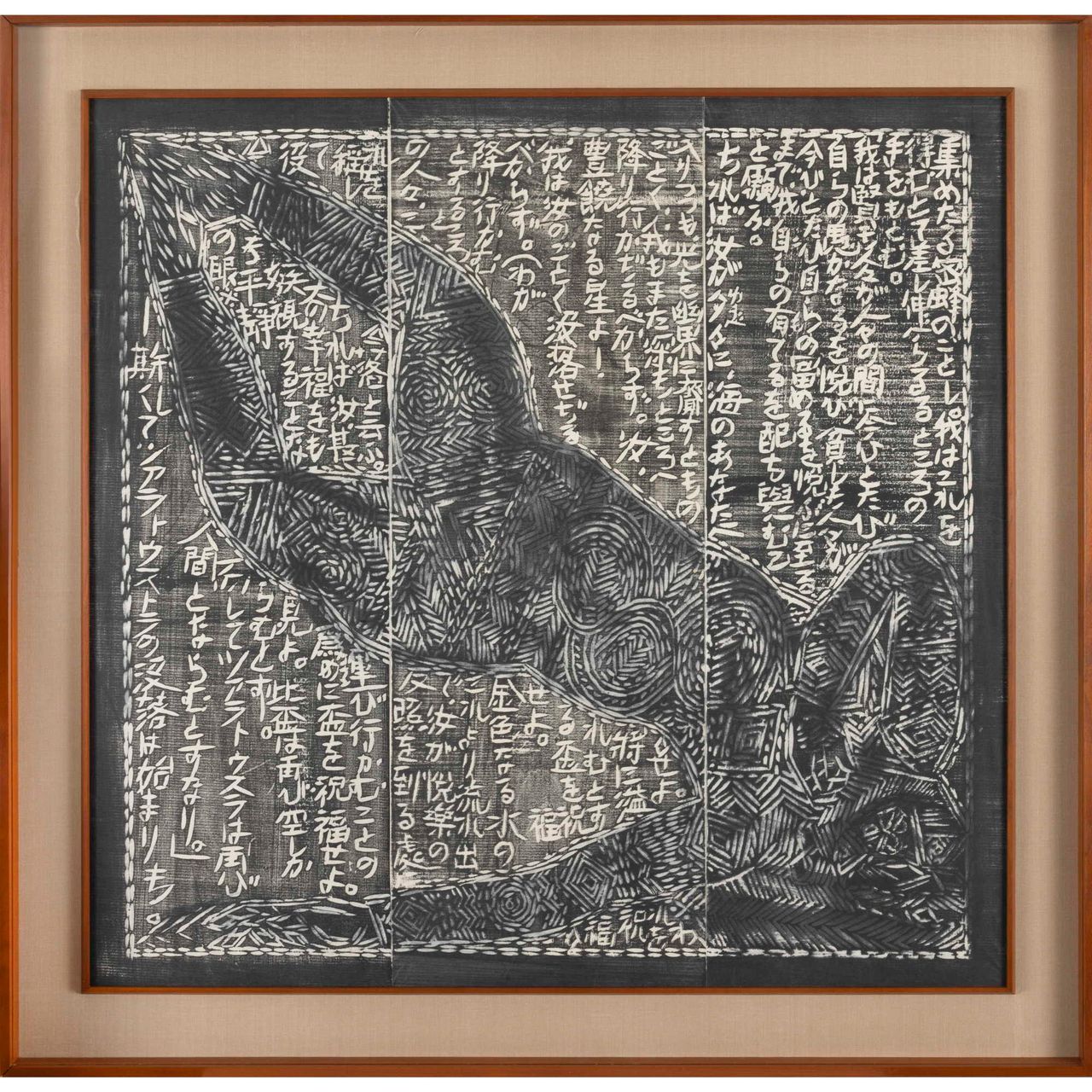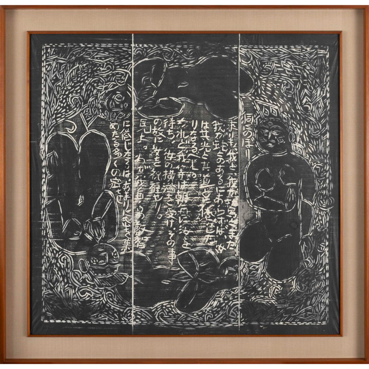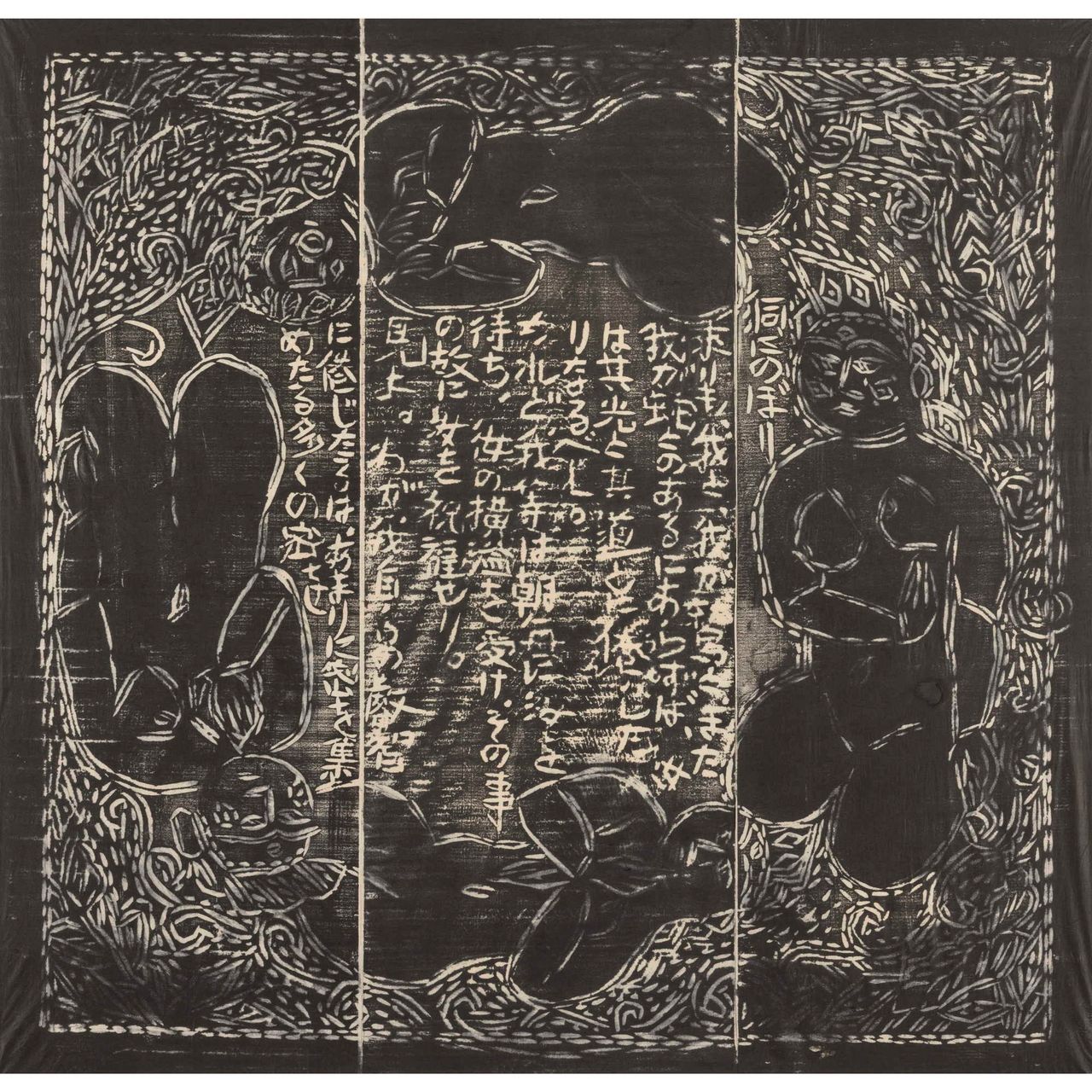 本作は『運命版画柵』は、別に『美尼羅牟(びにろん)頌運命版画柵』とも命名され、棟方が、昭和26年(1951)に疎開先の富山県福光町(現南砺市)より東京荻窪に再上京し手掛けた最初の作品で、4部柵として構成される。「運命」とは、ベートーベンの第五交響曲から主題とし、疎開先で読んだニーチェ全集から「ツァラトゥストラの巻、第一部序説一」を全面に彫制作したものである。