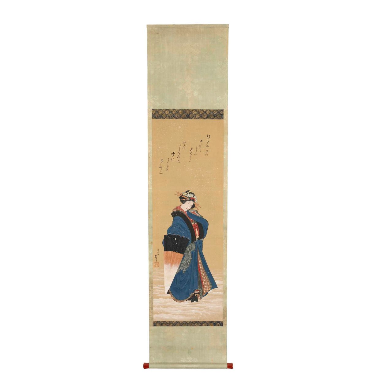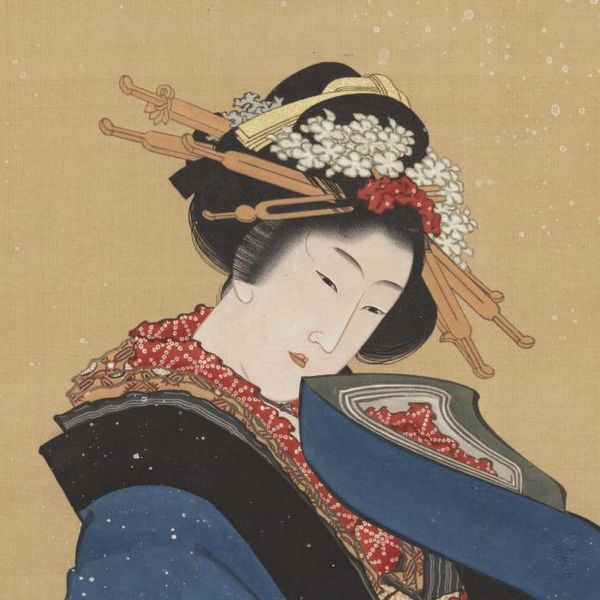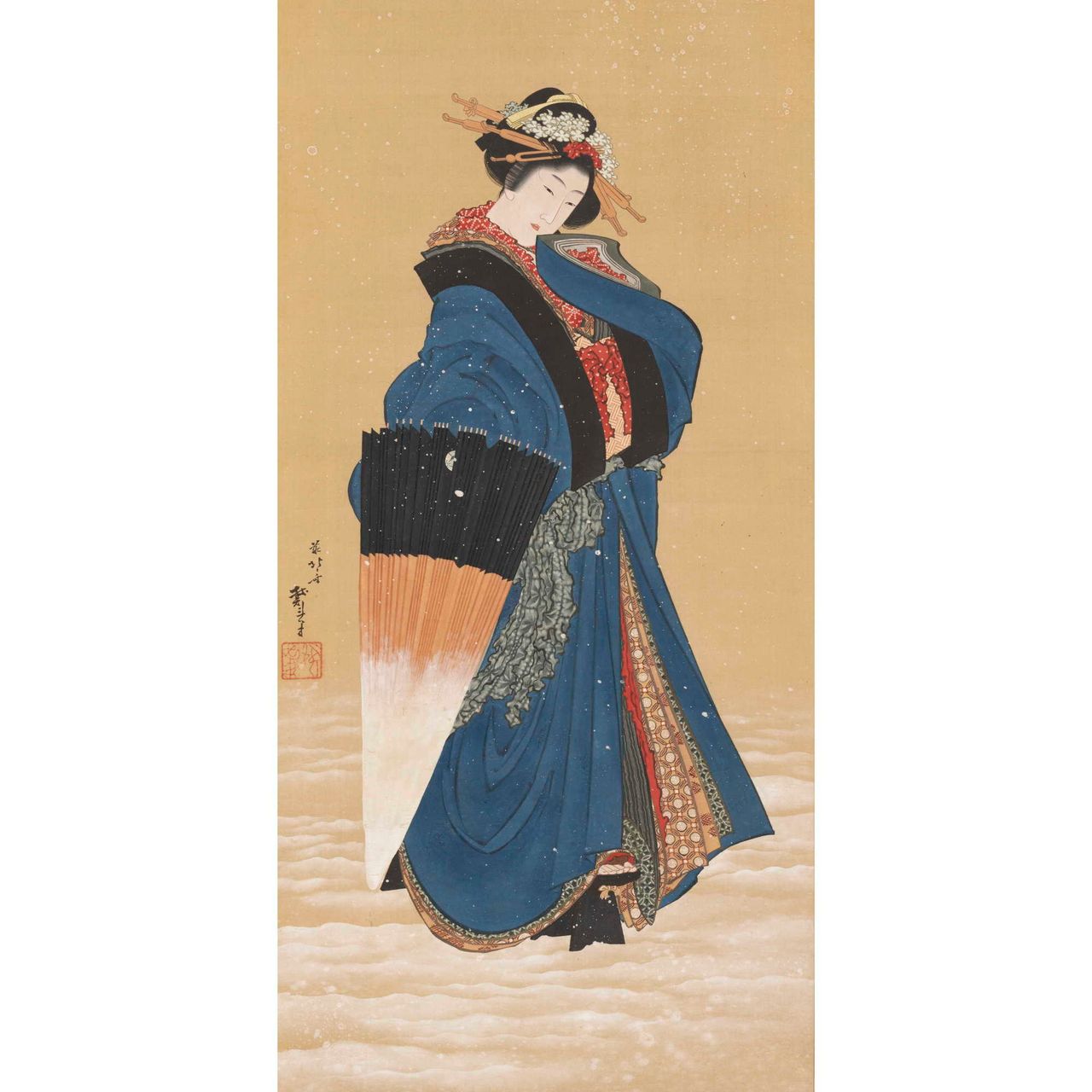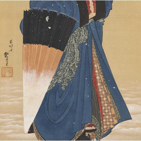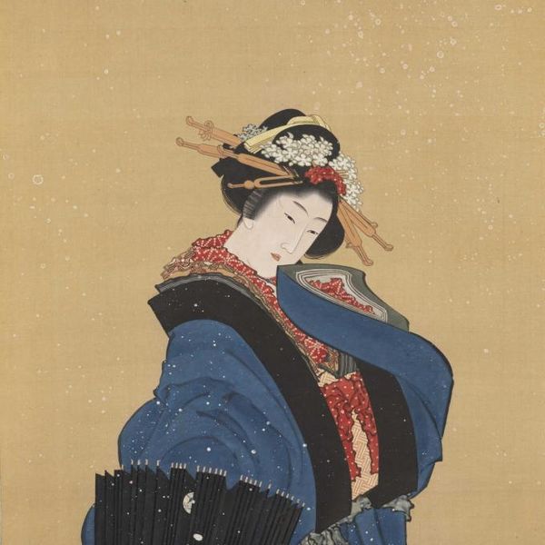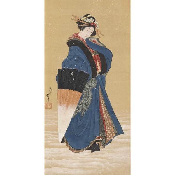 本作は、雪中に佇む花魁を描いた、葛飾北斎による肉筆による美人画の代表作の一つである。後の「北斎ブルー」を思わせる鮮やかな青の着物を重ね、舞い散る雪をまとうすらりとした立ち姿。その背景に広がる胡粉により表現された雪景は、藍色の濃密な衣装と響き合い、雪降る静けさと清涼な気配を漂わせている。