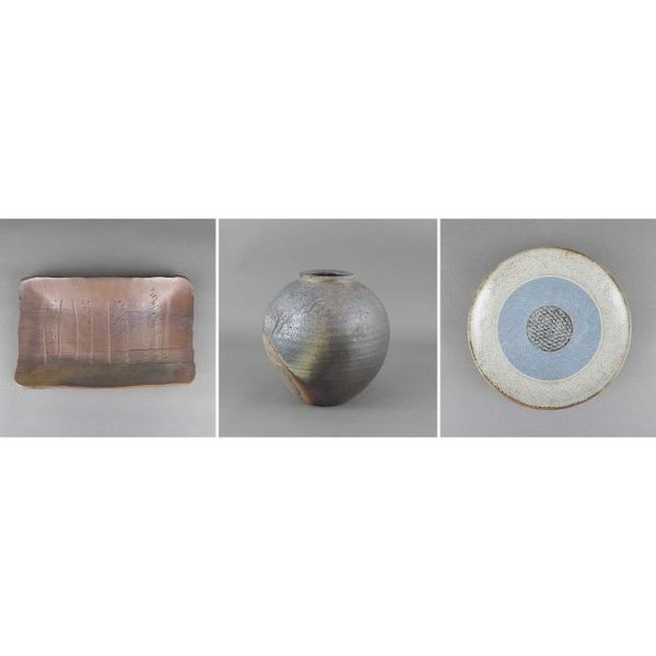 (1)備前長板皿 (2)備前花瓶 (3)地釉縄文象嵌皿 3点