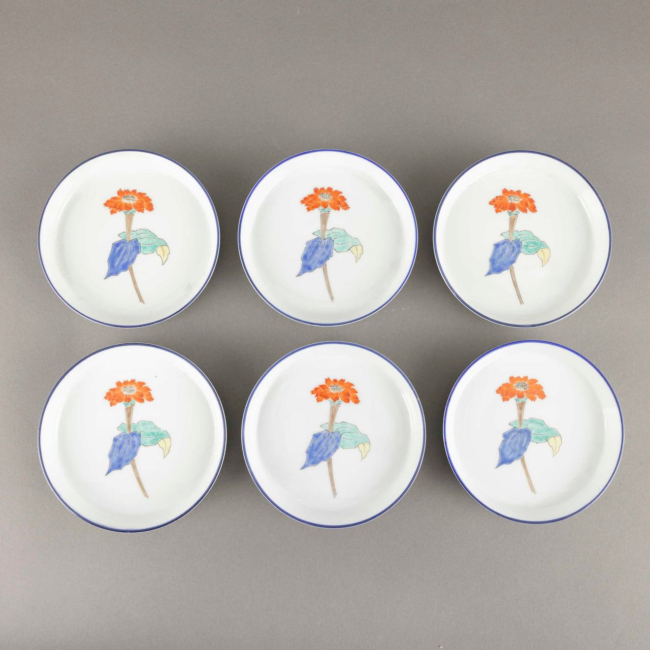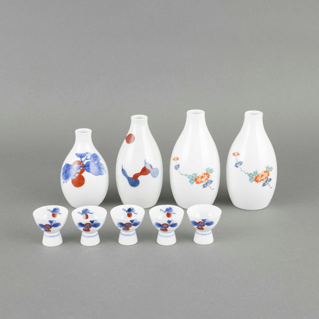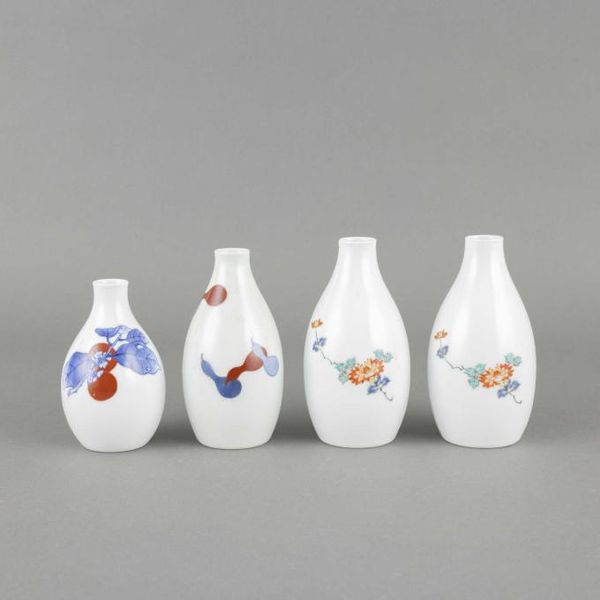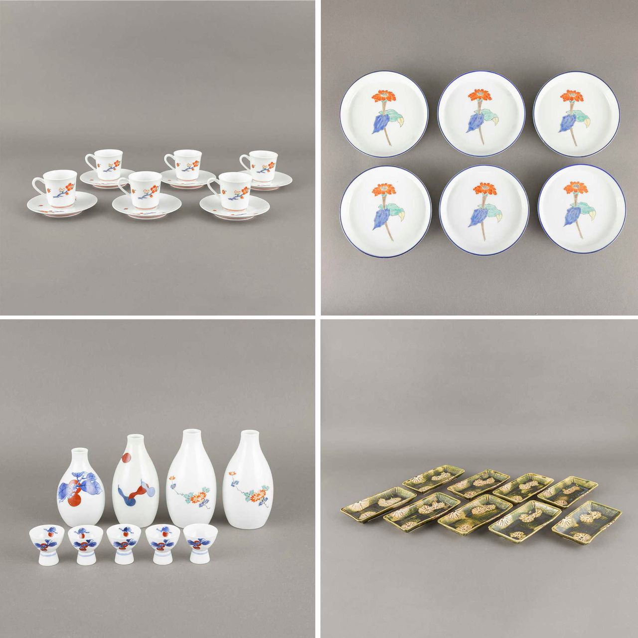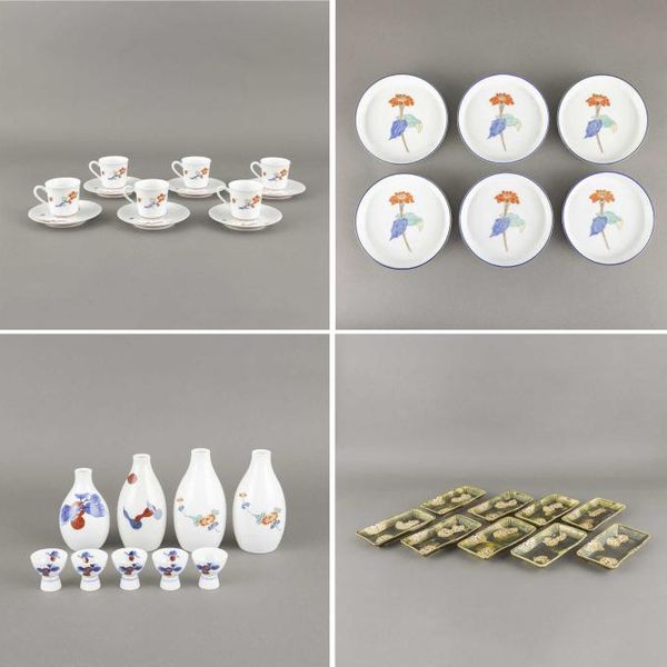 (1)13代柿右衛門 錦桜花文珈琲碗 6客 (2)13代柿右衛門 錦百日草皿 6枚 (3)12代柿右衛門 各種酒器9点 (4)加藤作助 おりべ長皿 9枚 シミ 共箱