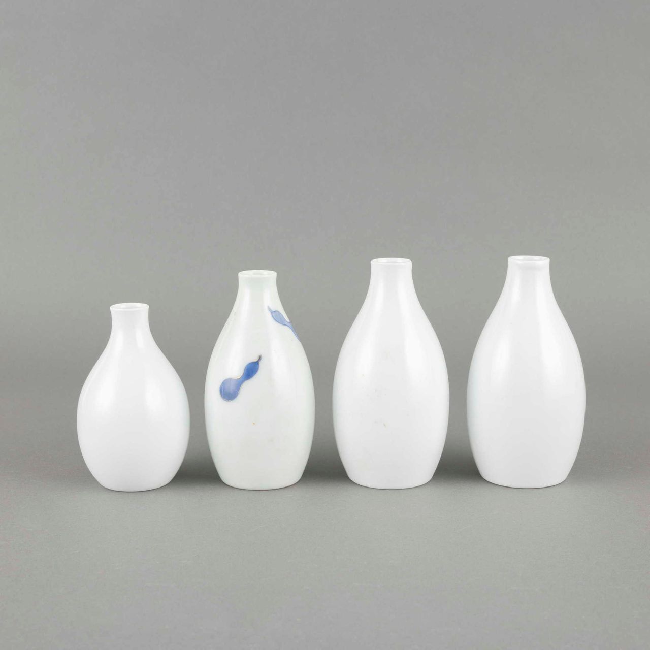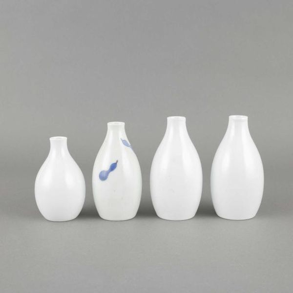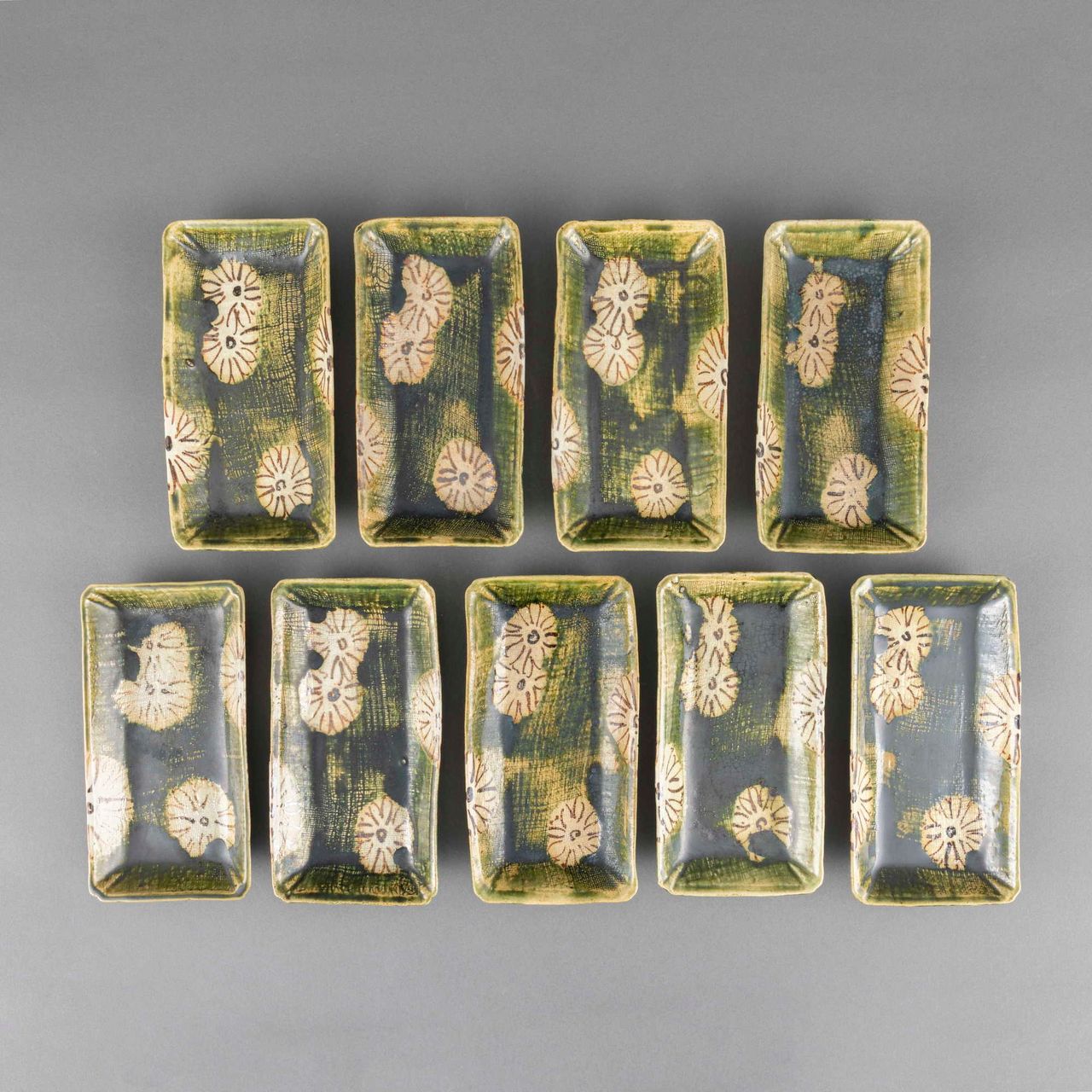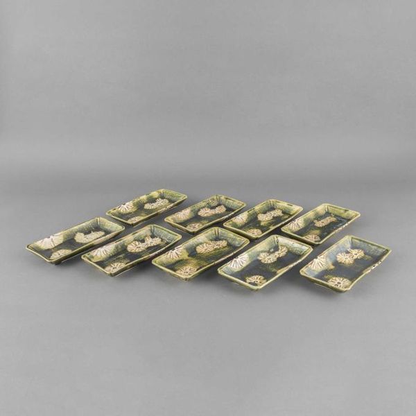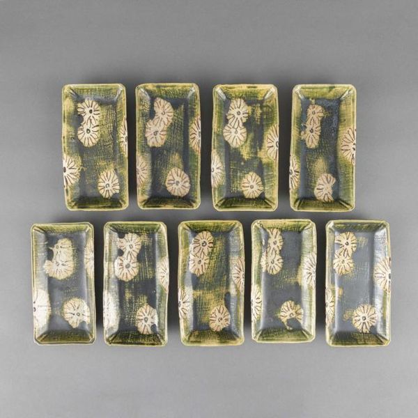 (1)13代柿右衛門 錦桜花文珈琲碗 6客 (2)13代柿右衛門 錦百日草皿 6枚 (3)12代柿右衛門 各種酒器9点 (4)加藤作助 おりべ長皿 9枚 シミ 共箱