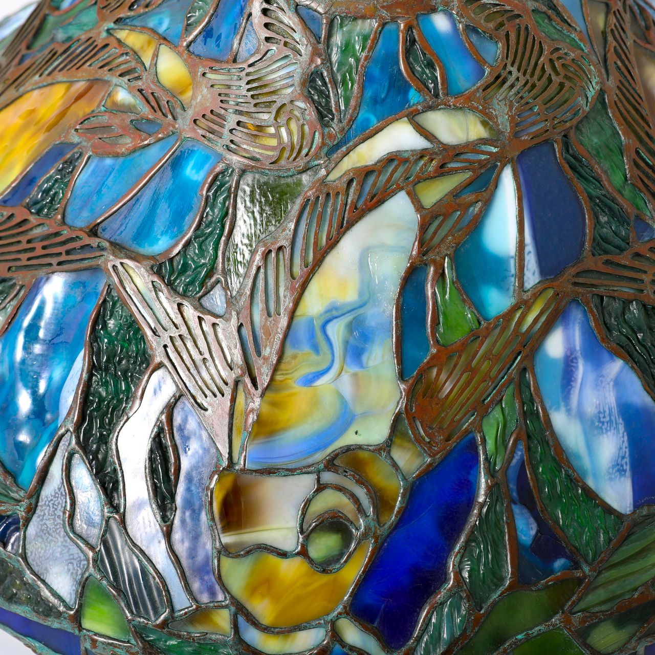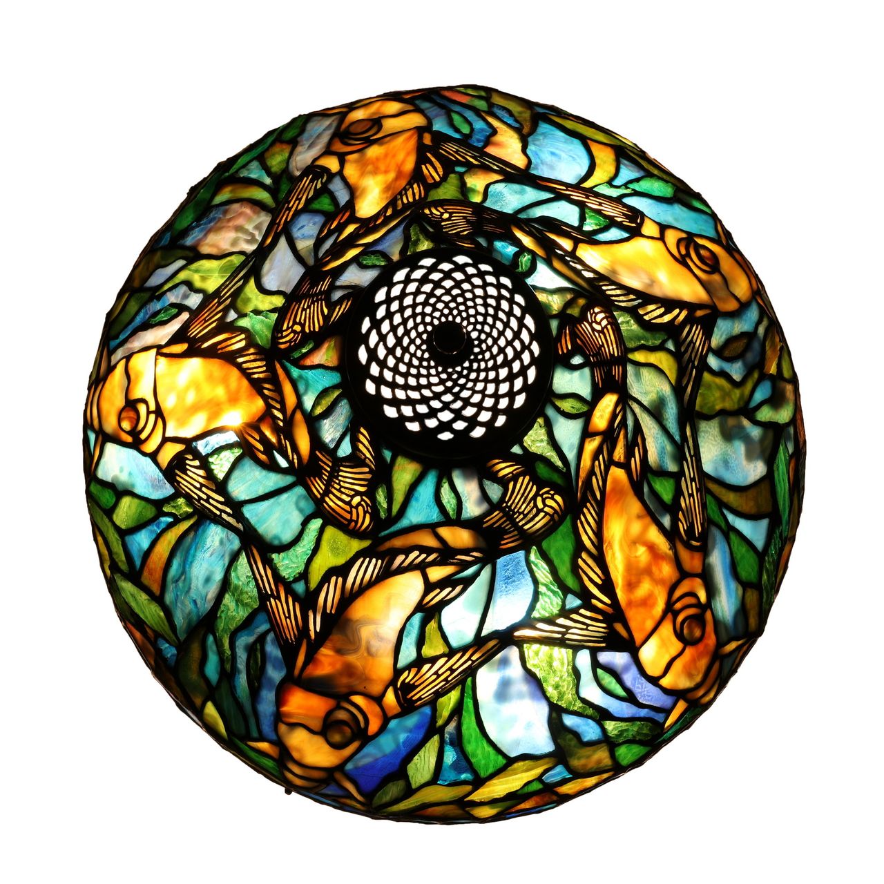 ステンドグラスランプの中で最高の美しさを誇るティファニースタジオの華麗な魚文のランプ。その大胆かつ繊細なデザインは、思わずため息が出るほど美しい。