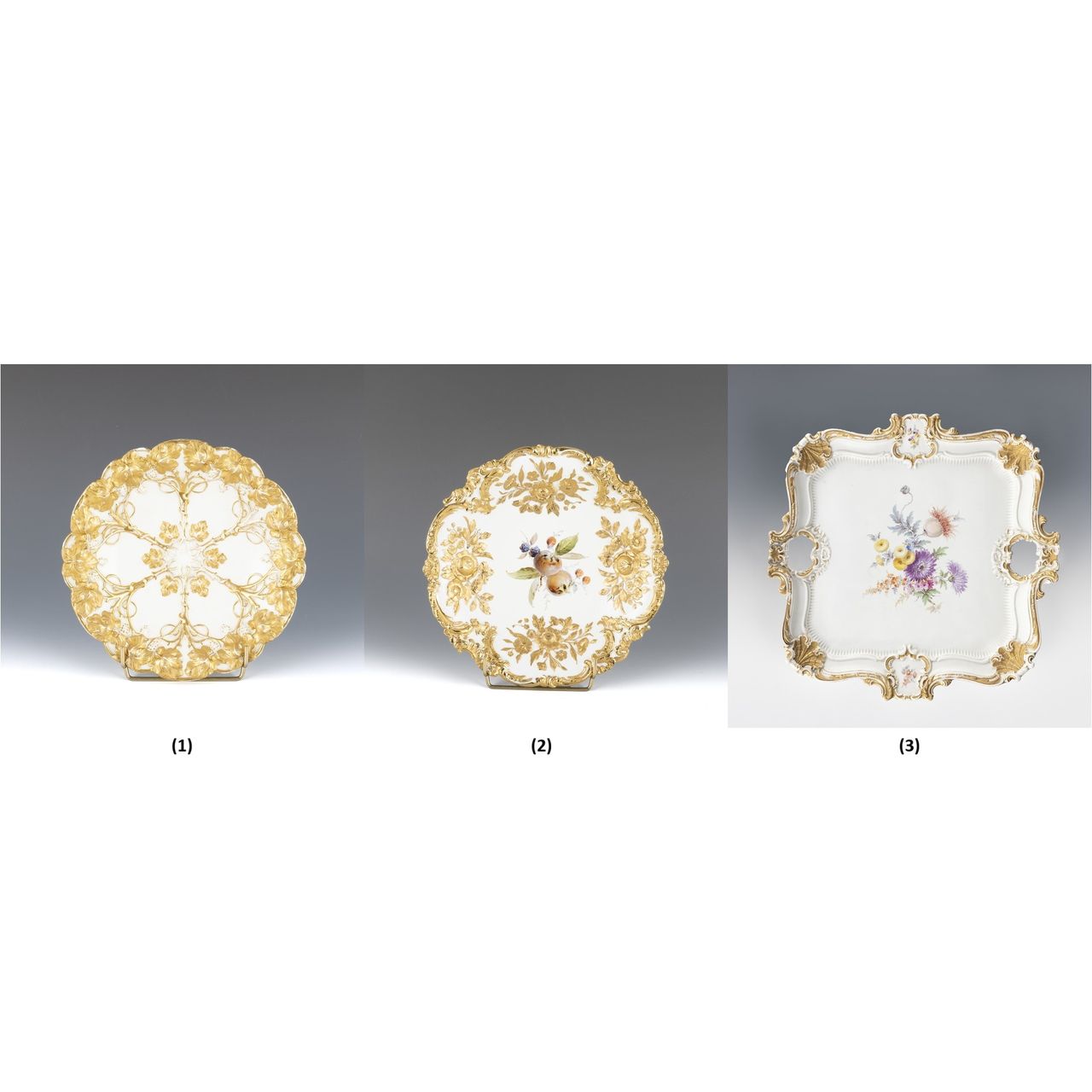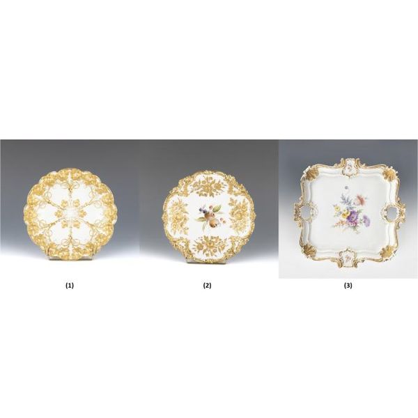 (1)(2)金彩飾り皿 (3)花文金彩トレイ 3点