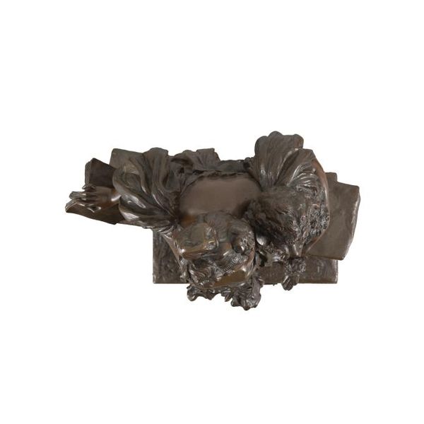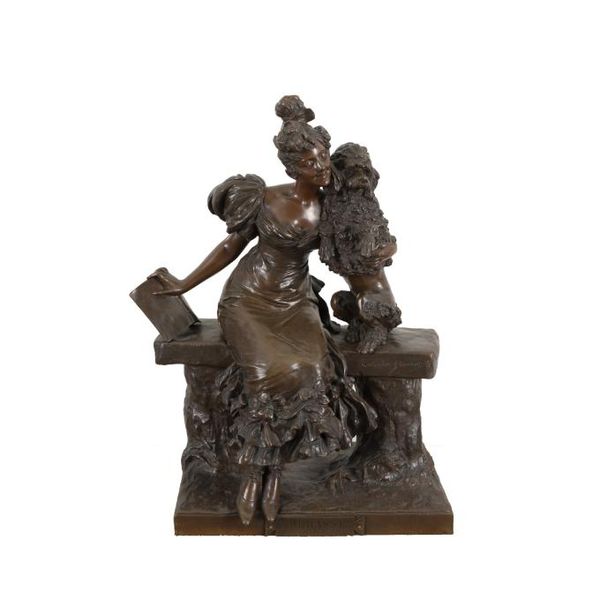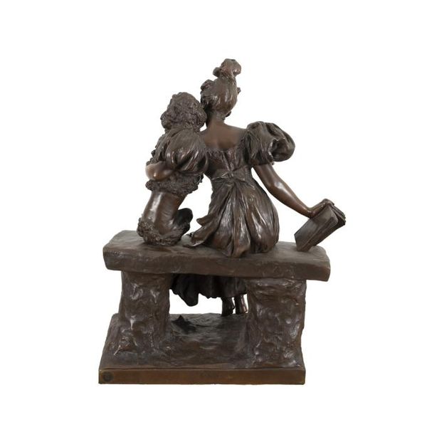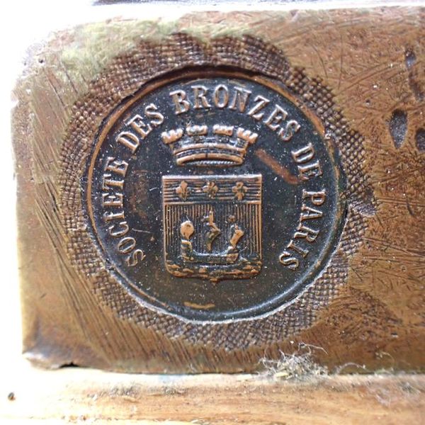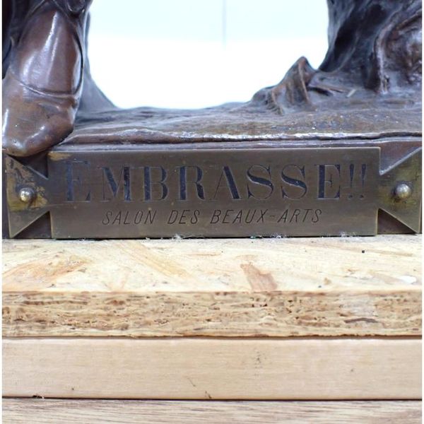 正面に陰刻銘、台座裏面に鋳造所印「SOCIETE DES BRONZES DE PARIS」、プレートにタイトル「EMMBRASSE!!」