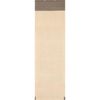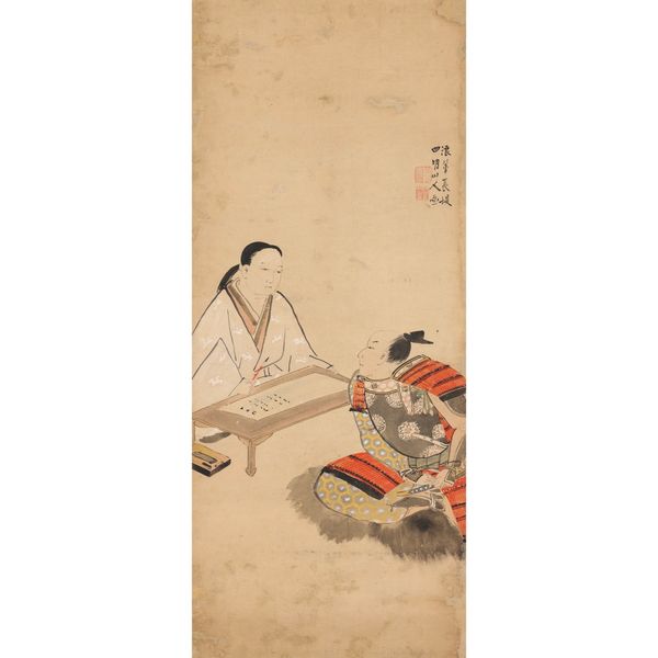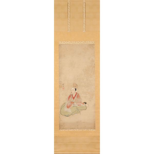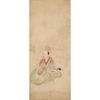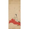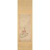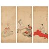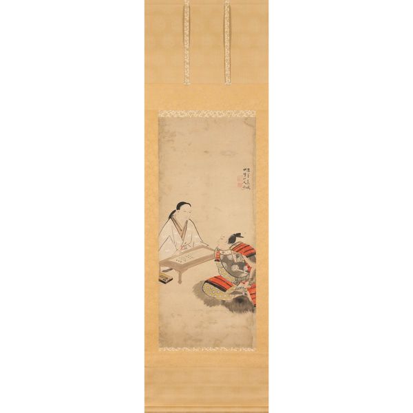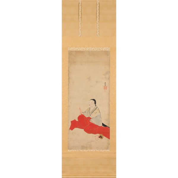 This work bears a seal used exclusively during the Shimodate period in Yūki, dating from Kanpō 2 to Hōreki 1 (circa 1742–1751), and is thus considered to be a work from Buson’s late thirties. The central scroll depicts a figure writing before a warrior in red armor, with a simple design rendered solely in gofun on the clothing. On the side scrolls, one figure holds a fan for Noh performance, with a drum nearby; the right figure wears scarlet hakama outlined in gold, and gold is also used on the patterns of the upper garment, fan, and drum. The left figure layers a scarlet jacket with gold chidori patterns over gauze, and wears a light green hakama decorated with a spider-web motif in gold. The composition, with its unusual arrangement and ample negative space, shows traces of the Rimpa school, while the overall style reflects a rustic, unpretentious sensibility, more textured and expressive than his later works.