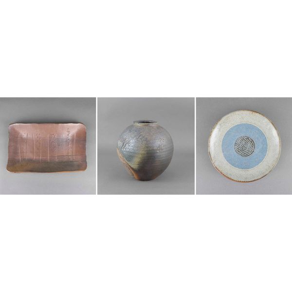 (1) BIZEN LONG RECTANGULAR PLATE (2) BIZEN VASE (3) PLATE WITH JIYU GLAZE AND ROPE-PATTERN INLAY 3 OBJECTS
