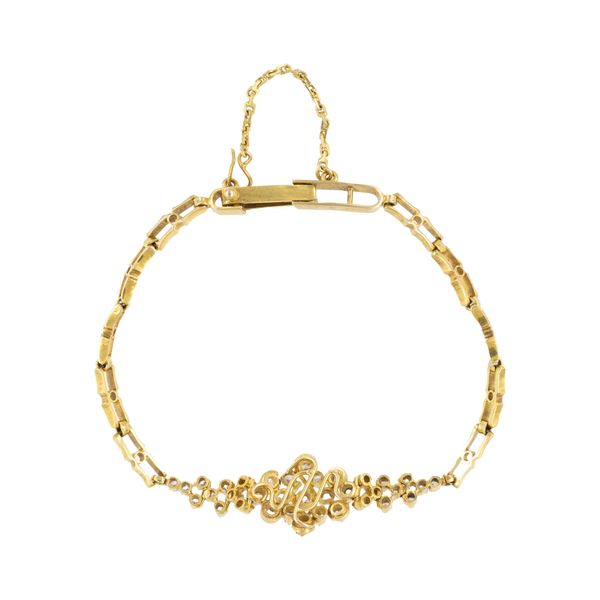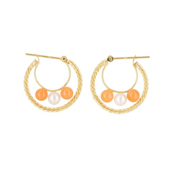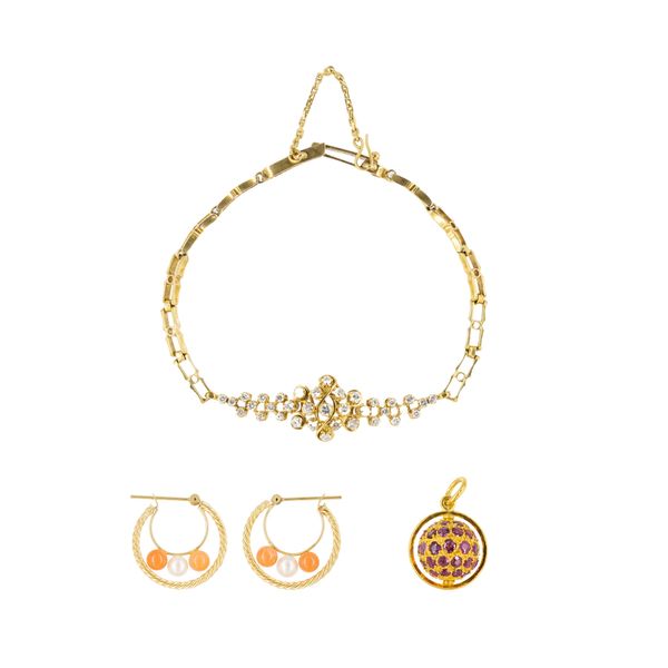 ① DIAMOND GOLD BRACELET; ② RUBY GOLD CHARM; ③ PEARL COLOR STONE GOLD EARRINGS, SET OF 3