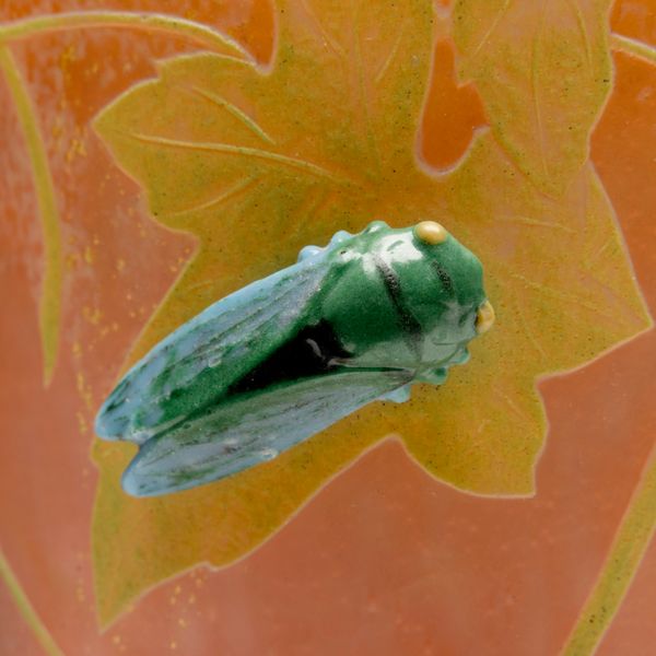 The glossy and striking cicada is applied in thick enamel layers of green, blue, and yellow, giving it a three-dimensional yet painterly effect. Additionally, gold leaf embedded throughout the glass sparkles brilliantly, enhancing the overall luminosity of the piece.