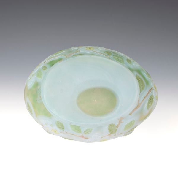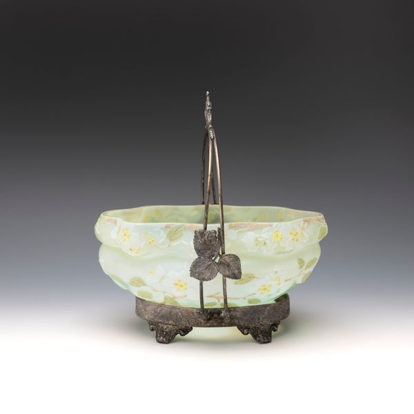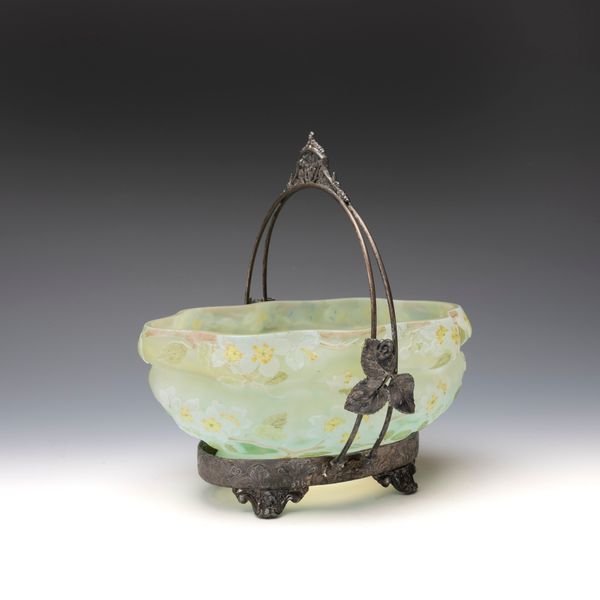 mottled ground, cased glass, acid etching, enameling, with silver handle