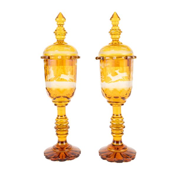 PAIR OF LIDDED GOBLETS WITH DEER MOTIF